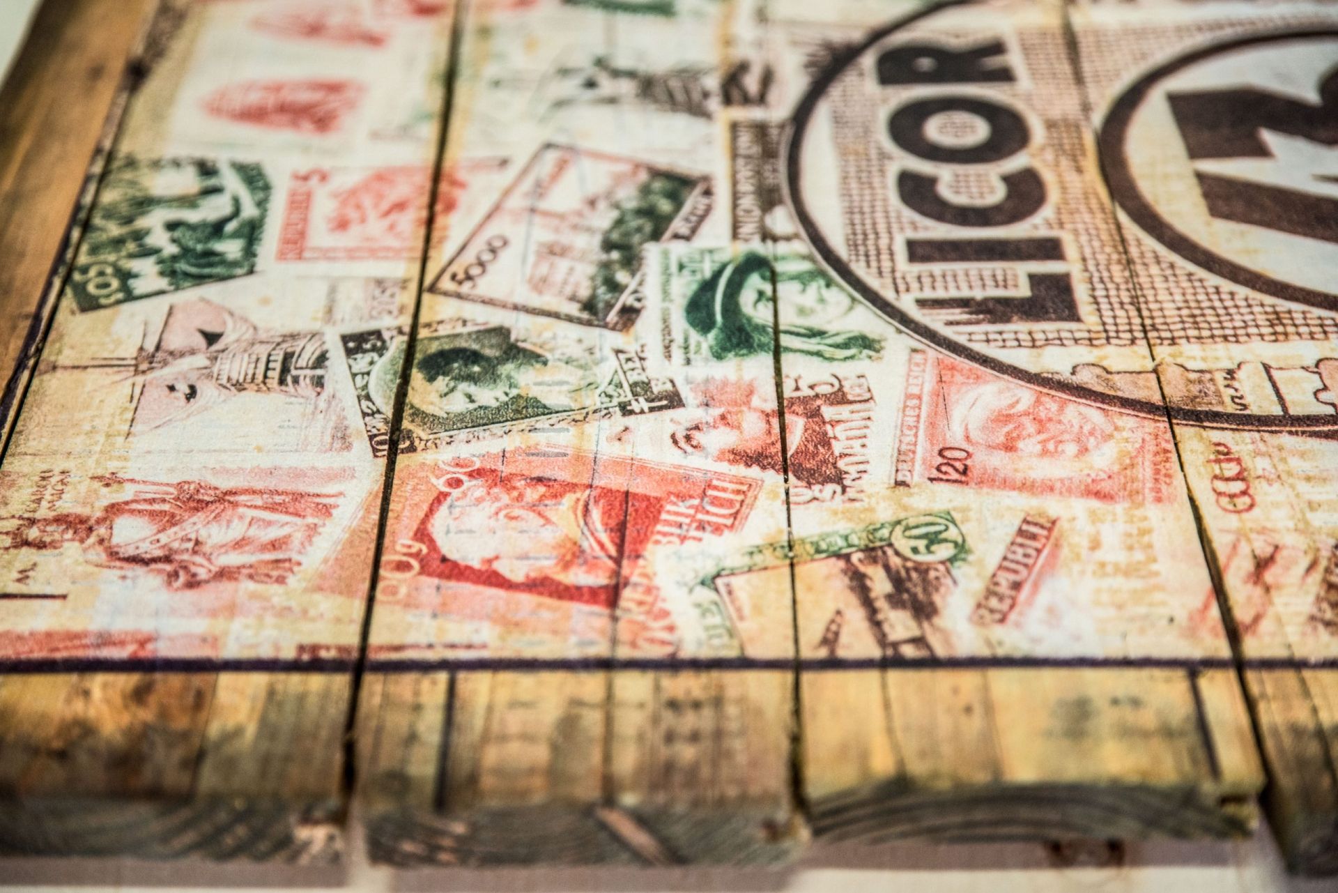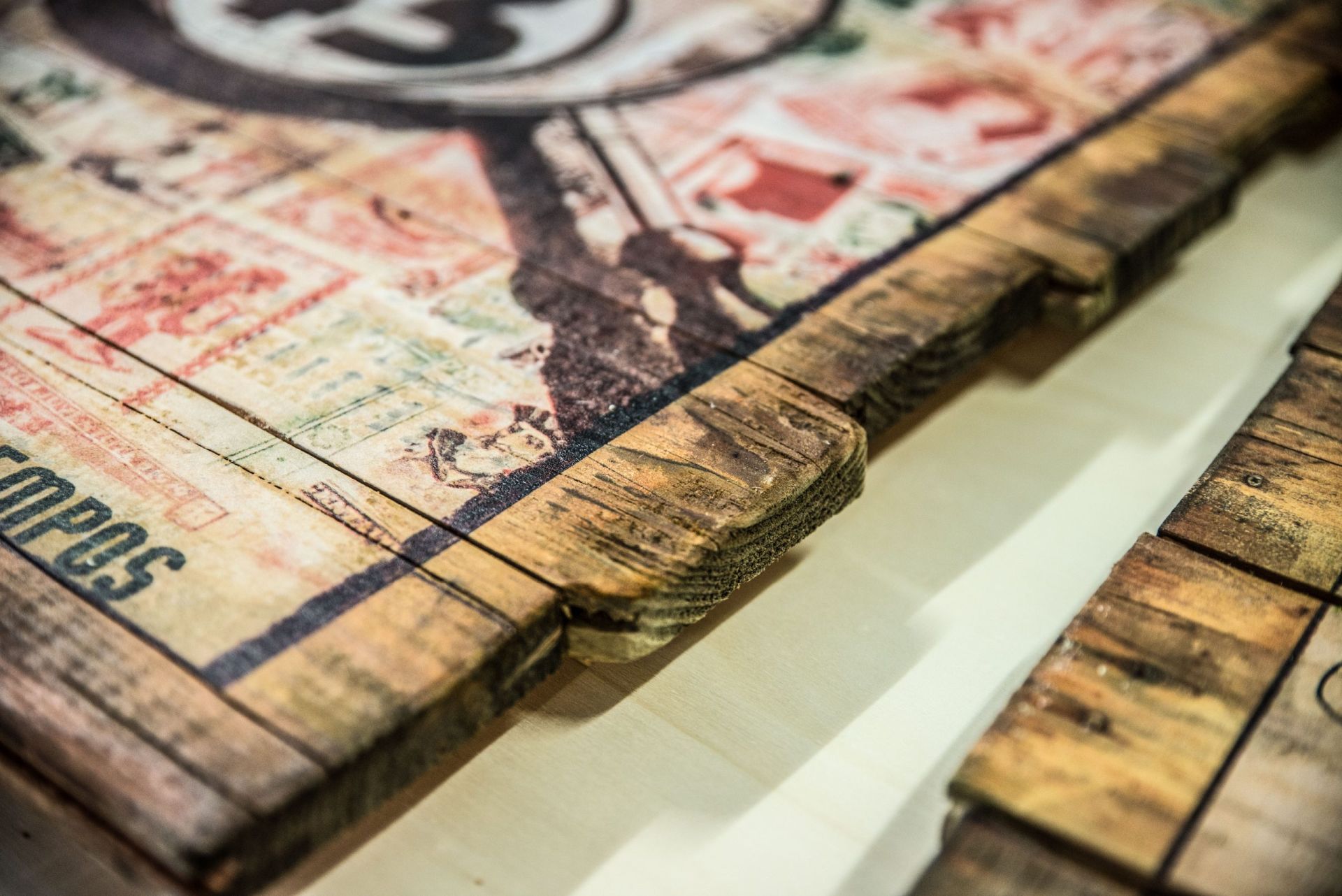 Logos & andere farbige Motive auf alten Holzlatten gedruckt