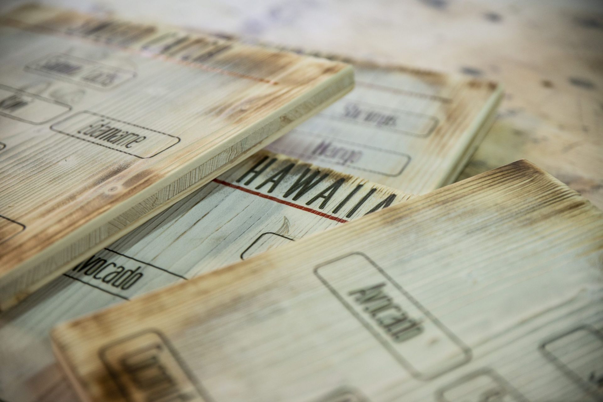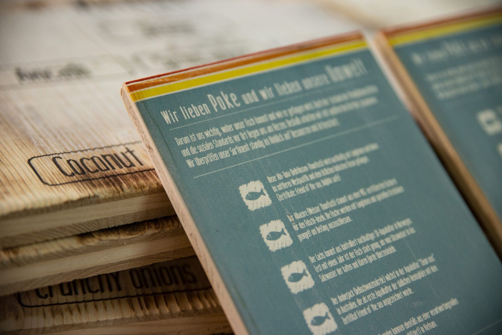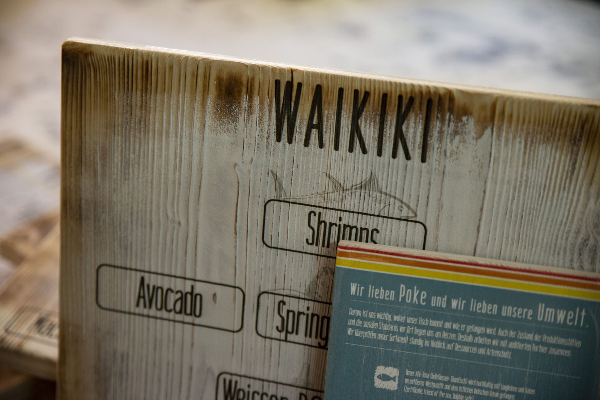 Für das hawaiianische Restaurant Aloha Poke entwickeln wir laufend neue Holzdrucke. Dieser Auftrag sollte eine bessere Präsentation diverser Tagesgerichte schaffen. Dafür haben wir eine spezielle Holzoptik entwickelt, die mit den Elementen und Farben sowie der CI des Geschäftes hervorragend harmoniert.