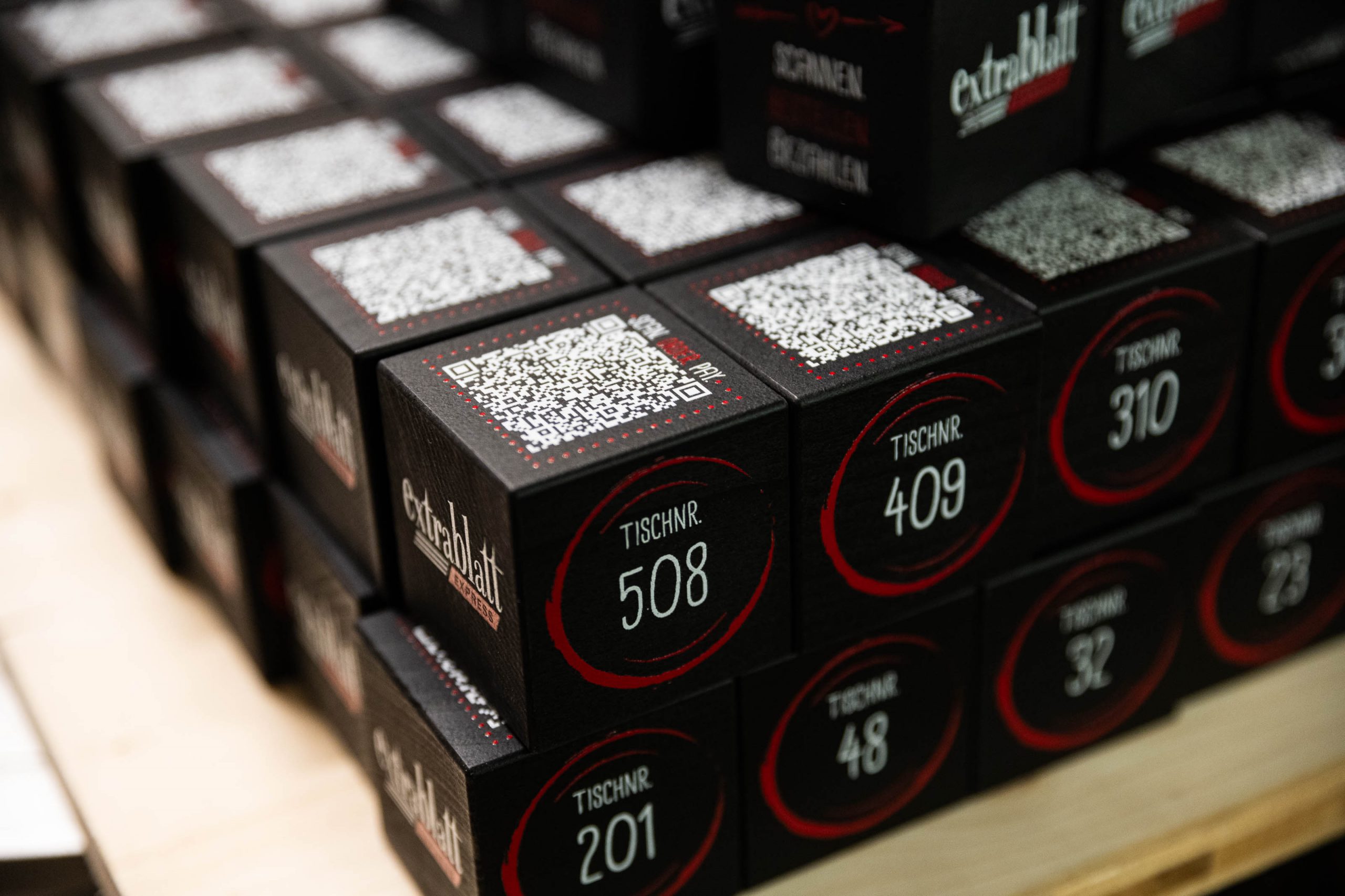Diese Holzwürfel wurden mit den Tischnummern seriell bedruckt