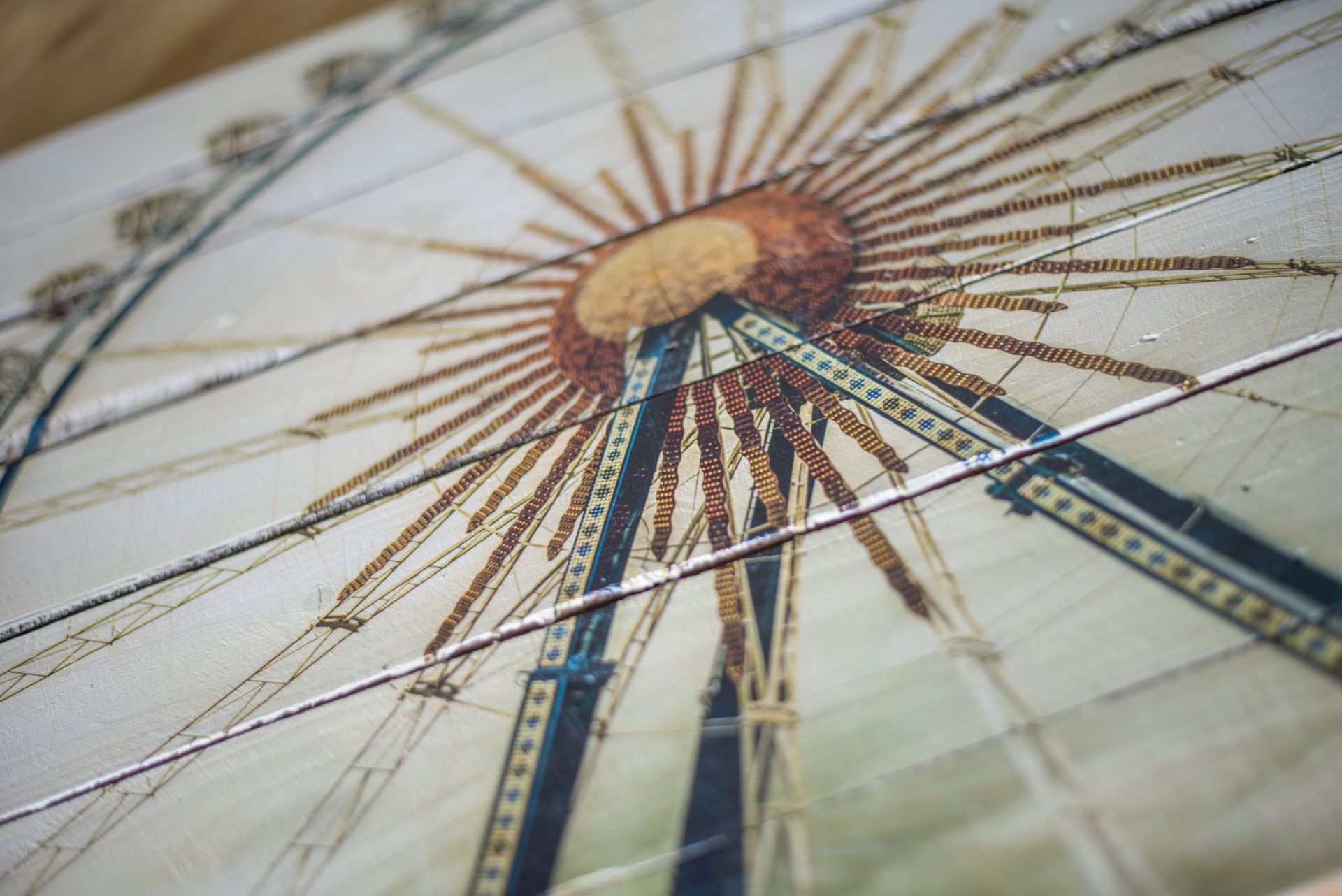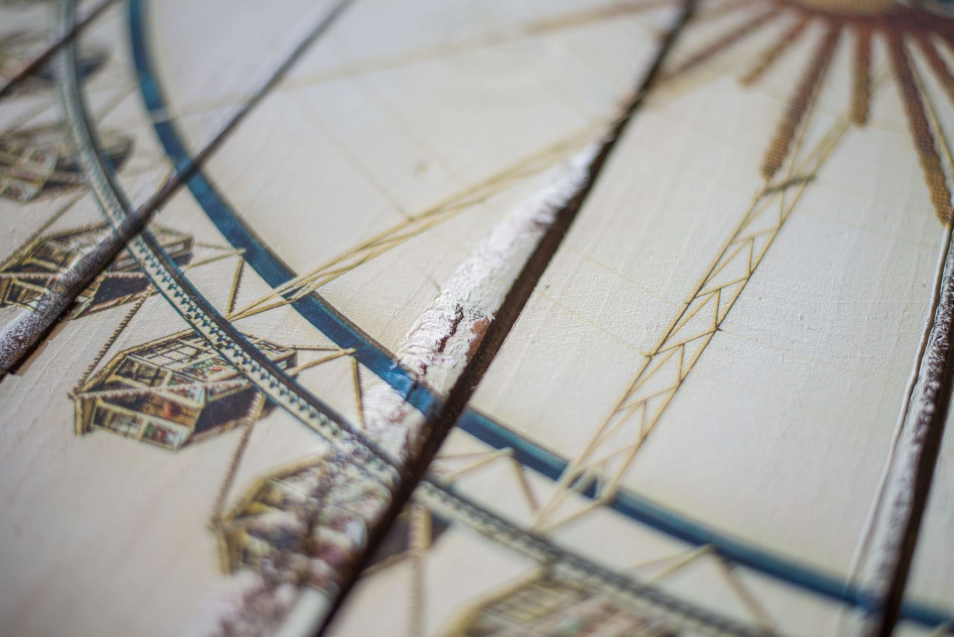 Das Holz für unsere vielseitigen Latten-Drucke stellen wir aus alten Zäunen, Schuppen oder Paletten her. Zuerst bringen wir das Material auf Format und verbinden es dann durch Querstreben, so dass eine möglichst plane Oberfläche entsteht. Hierbei ist zu beachten, dass alte Holzlatten nicht für jedes Motiv geeignet sind: Bedingt durch die Randstruktur der einzelnen Latten entstehen beim Zusammenfügen der einzelnen Hölzer Spalten bis zu einem Zentimeter Breite. Da wir die Holzlatten in einem möglichst originalen Zustand belassen möchten, korrigieren wir Ungleichmäßigkeiten so gut wie nicht.